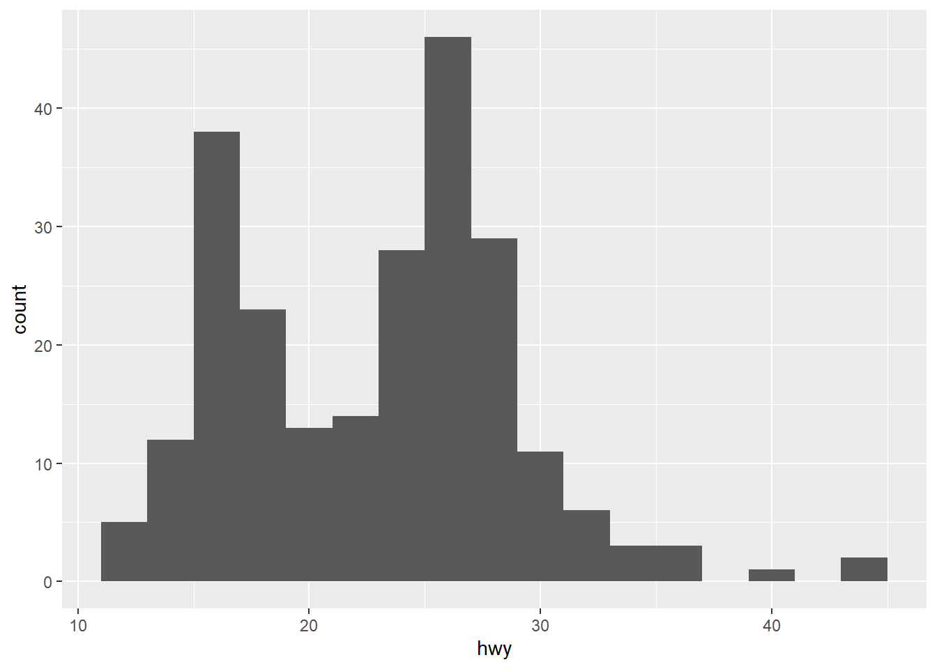 1つの量的変数の分布をみる場合はヒストグラムを使います。ggplot2では、geom_hist()関数を用います。mpgデータで高速道路の燃費hwyの分布をみる場合は以下のようにします。